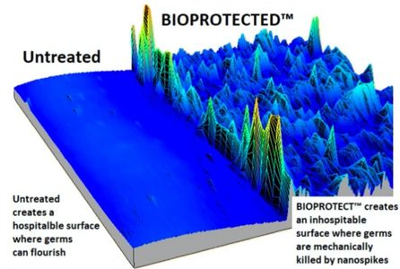 When BIOPROTECT™ is applied to a surface or incorporated into the manufacturing process, BIOPROTECT™ forms a covalent bond with the surface creating a durable antimicrobial protective layer. This layer forms a nano-bed shield of spikes (self assembling monolayer), each of which carry a positive charge that attracts the negatively charged bacteria. Once attracted, the molecular spikes pierce the cell and rupture its cell membrane, causing bacterial pathogens to die on contact.