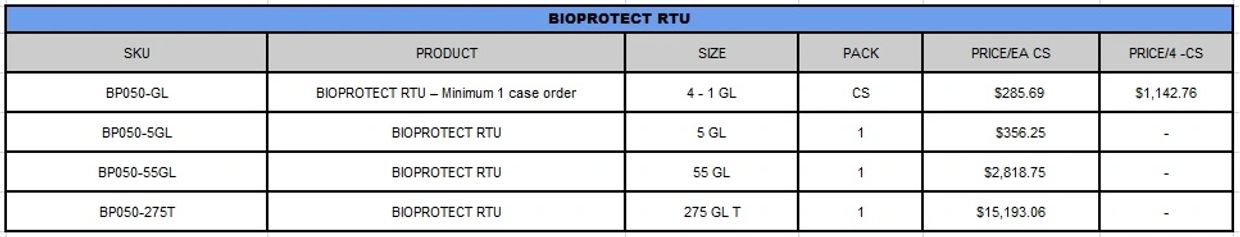 bacteria, mold, mildew, algae and fungus. Requires no rinse and is safe for food contact surfaces. Our patented water-based antimicrobials then render the same surfaces BIOPROTECTED™.