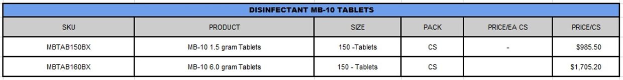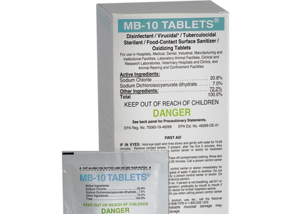MB-10 Tablets, which come in both 1.5 and 6.0-gram sizes, are also approved by the CA Department of Pesticide Regulation as a bactericide, virucidal, tuberculocidal, disinfectant and sterilant that eradicates microbes, sanitizes and oxidizes pollutants on surfaces.